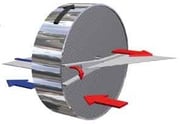 Les flux ne sont ici pas simplement croisés. Sur une partie du trajet de l’air, les flux sont croisés à contre courant, ce qui permet d’augmenter le rendement d’échange par rapport à l’échangeur