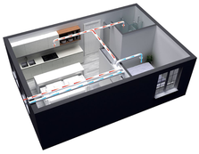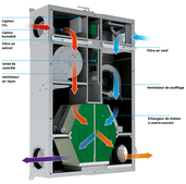 Ventilation double flux haut rendement avec système de chauffage réversible associé. Le réseau de ventilation sert de réseau de diffusion du chauffage et du rafraîchissement. En plus de sont rôle de ventilation, l'air chauffé et rafraîchi qui est diffusé dans les pièces permet un gain supplémentaire de confort et d'assurer un complément d'énergie associé avec une pompe à chaleur air-air intégrée.