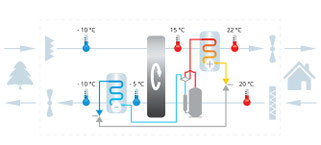 Pour cela la ventilation thermodynamique associe un récupérateur d’énergie passif et une pompe à chaleur (PAC).